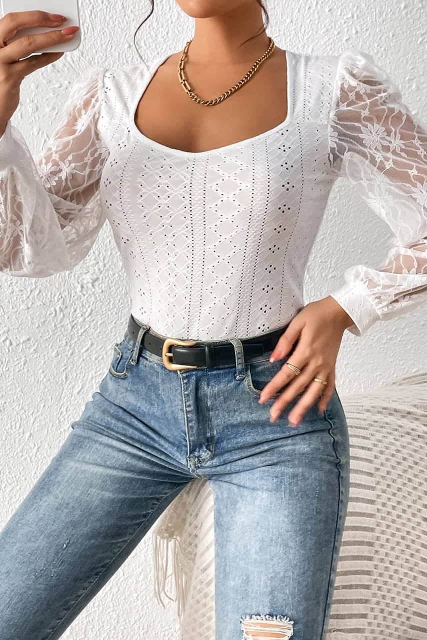 - Eyelet textured bodice with sheer lace puffy sleeves