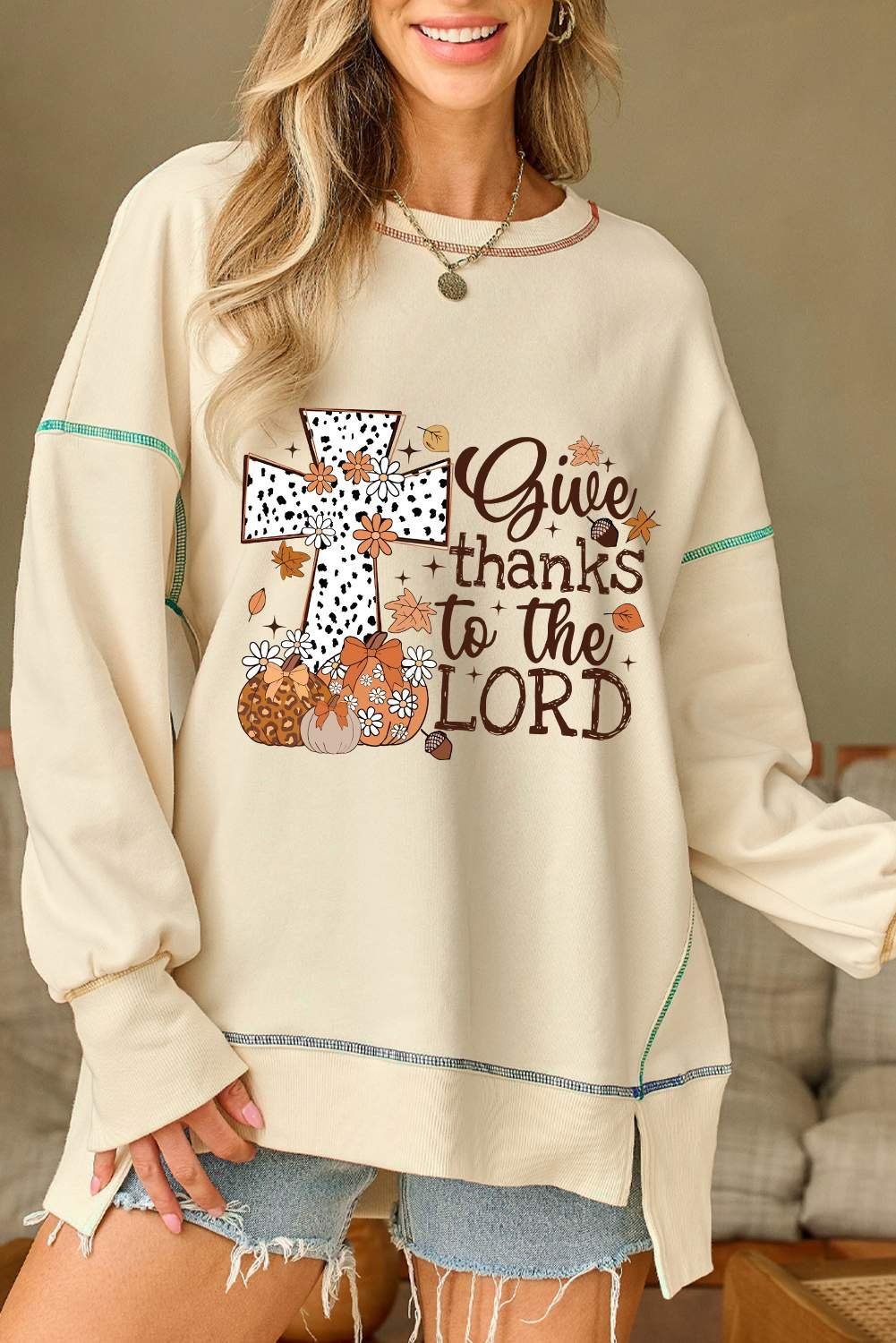 - The sweatshirt is a stylish piece for expressing gratitude and faith.