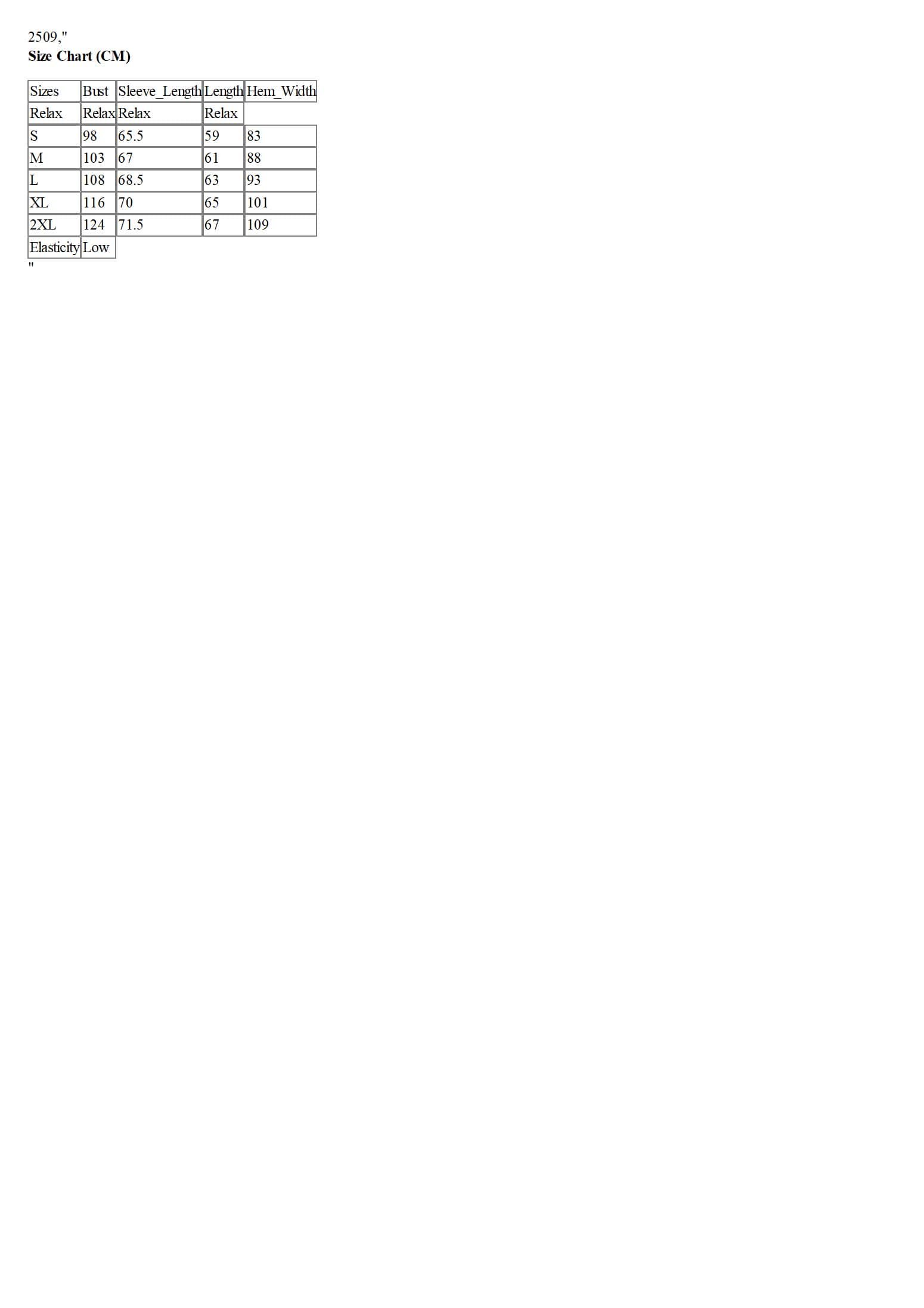 Sizes | Bust | Sleeve_Length | Length | Hem_Width |