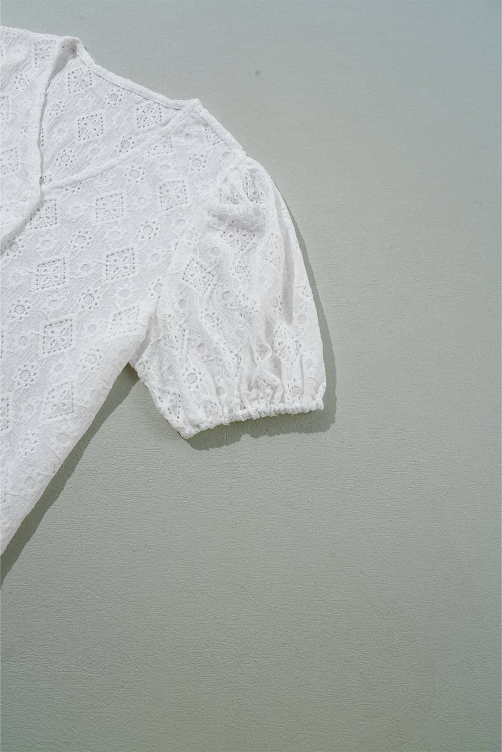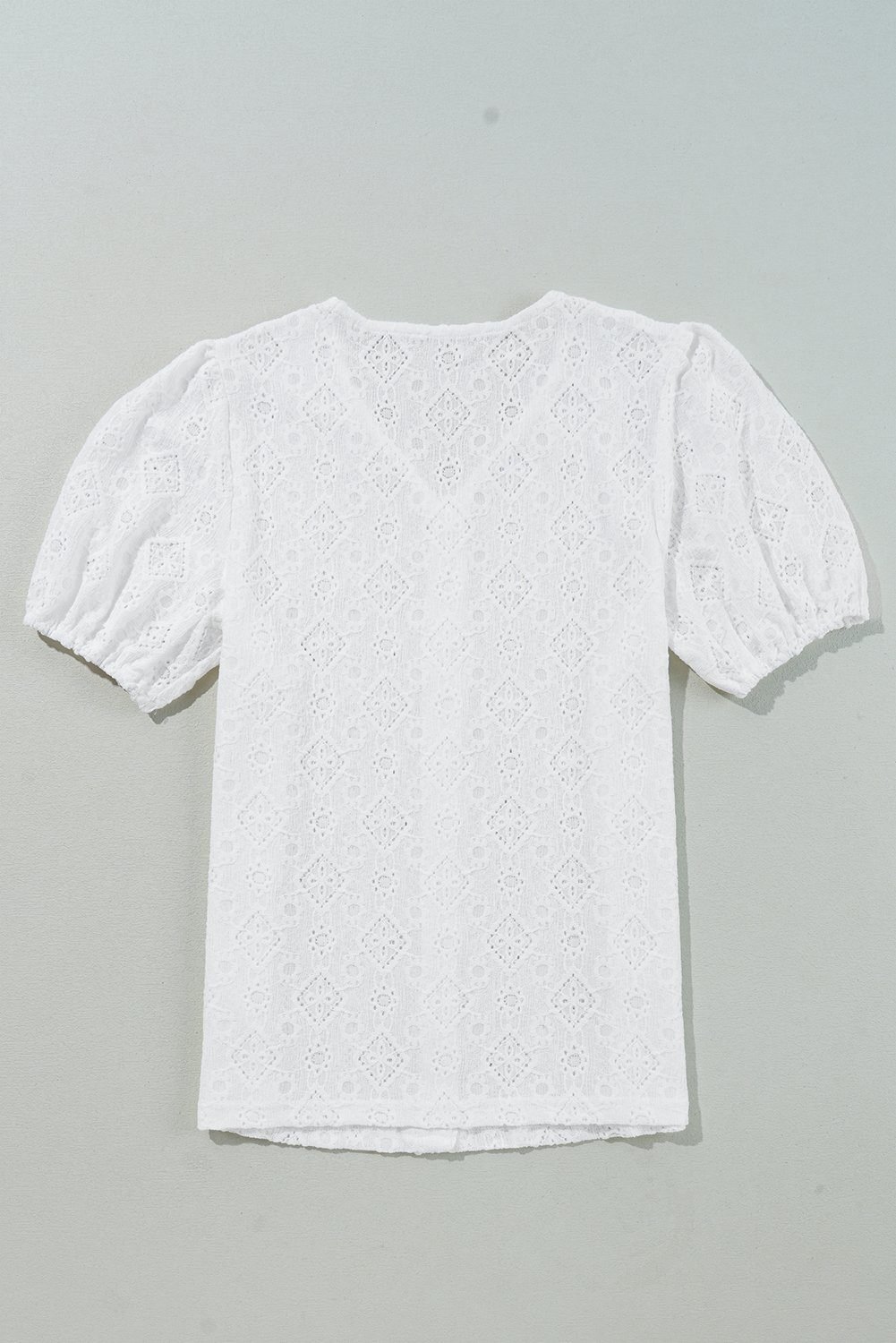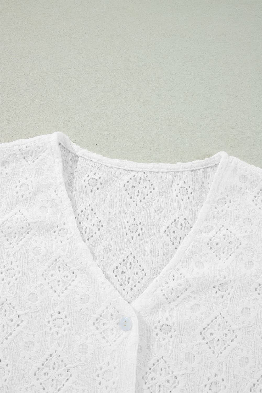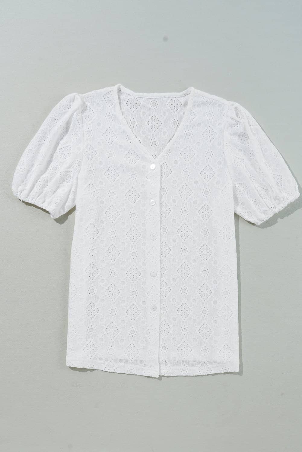 White Lace Puff Sleeve V Neck Button Up Shirt