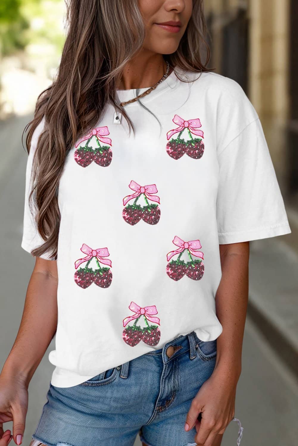 White Sequin Bow Strawberry Graphic Crew Neck T Shirt