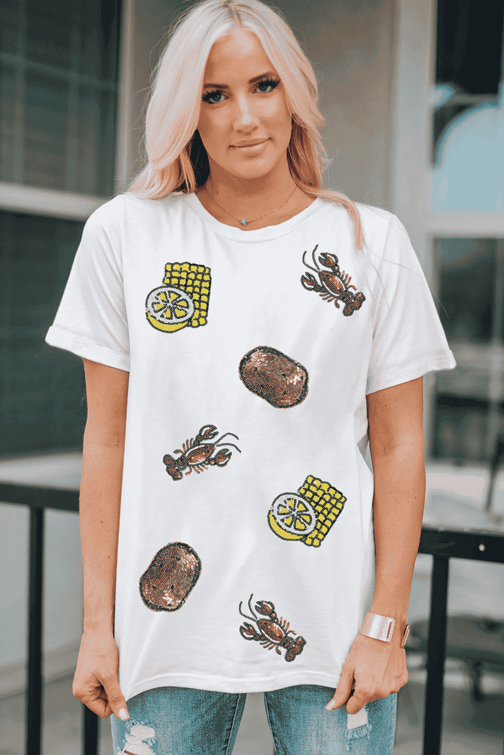 - This tee features a playful graphic with crawfish, corn, lemon and potatoes.