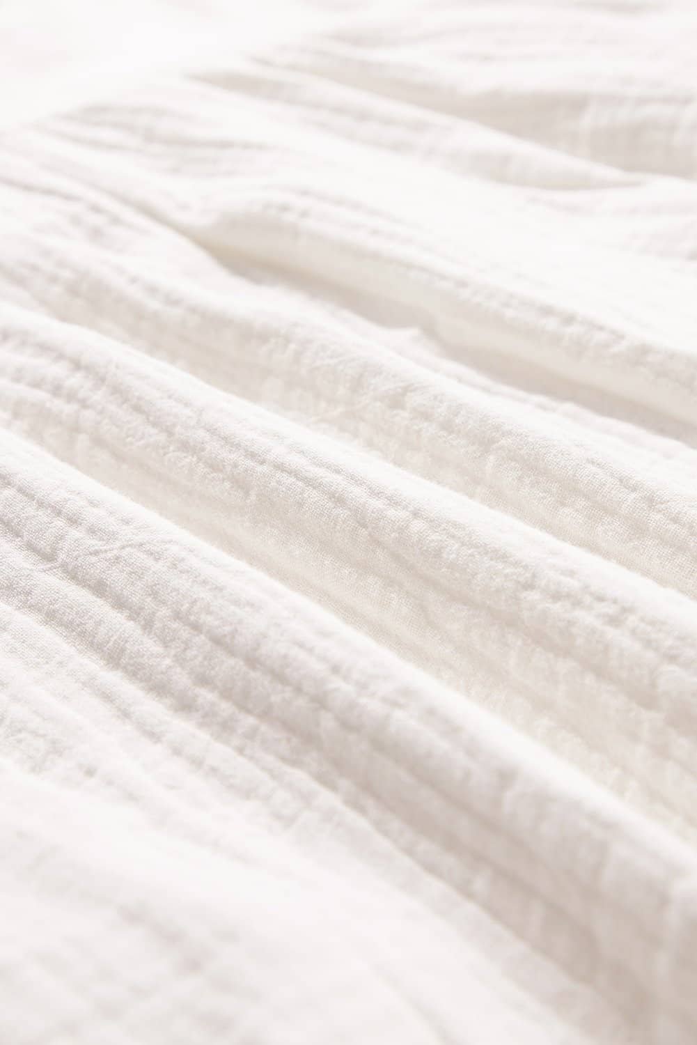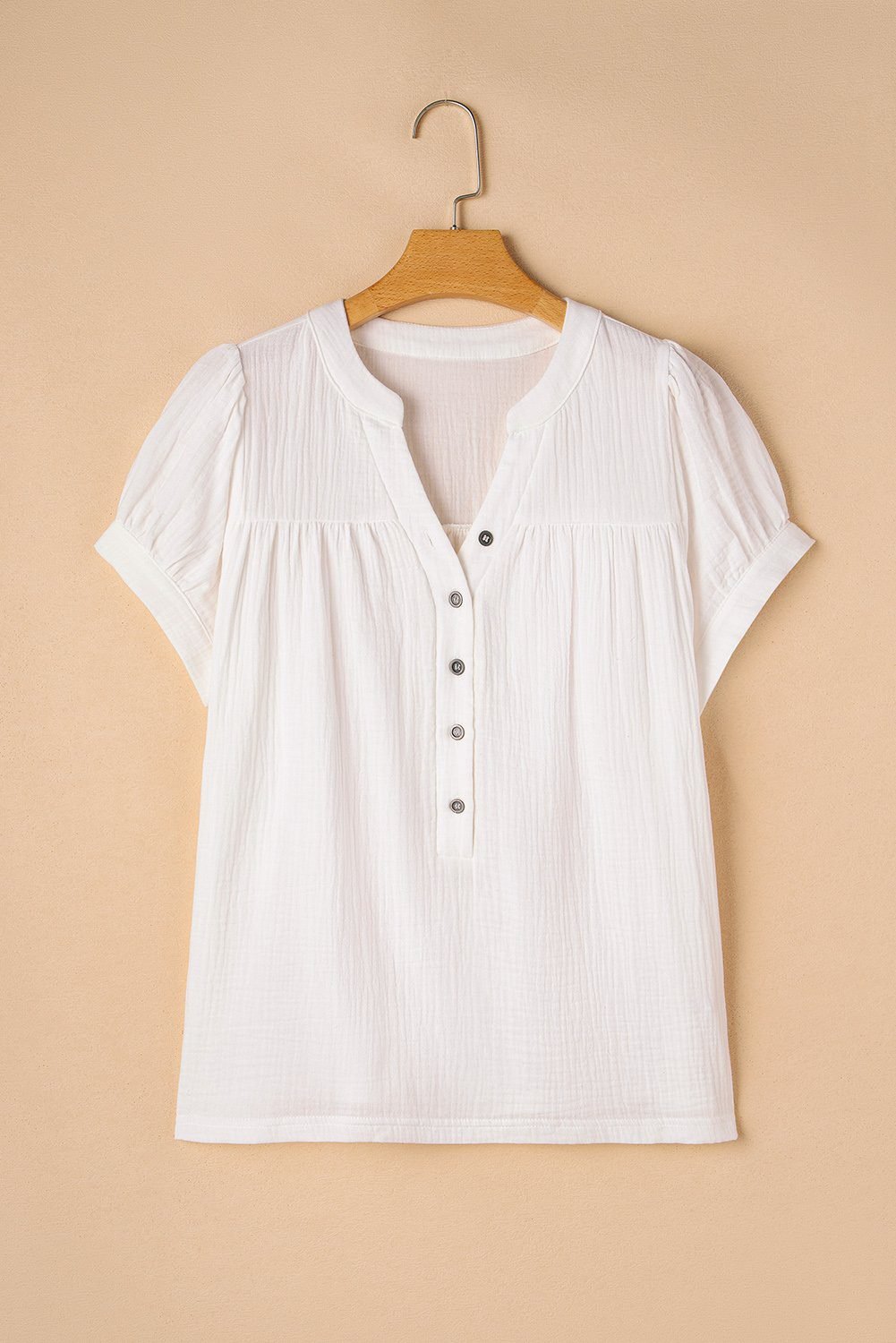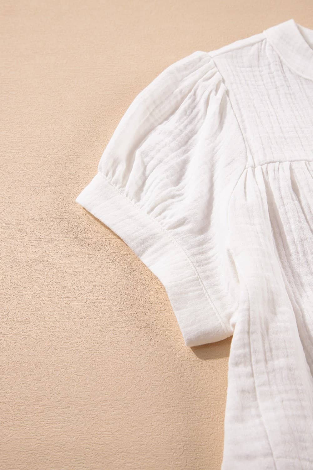 It has a buttoned split neck, cuffed short sleeves, and a flared silhouette.