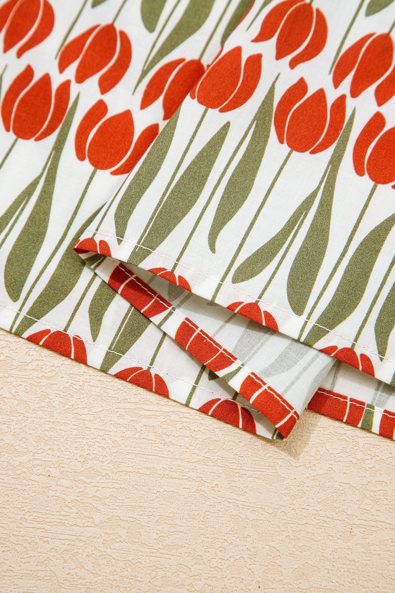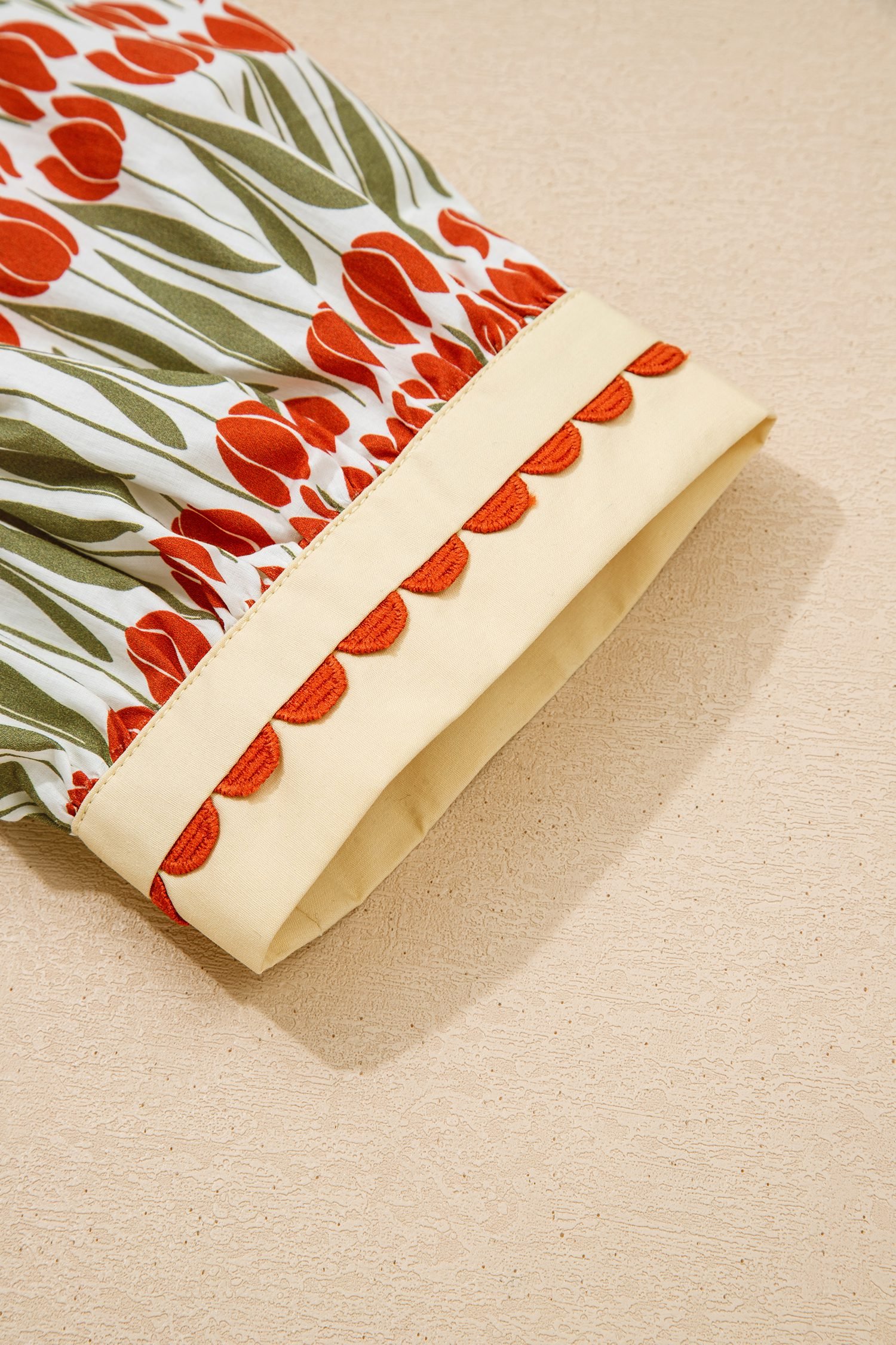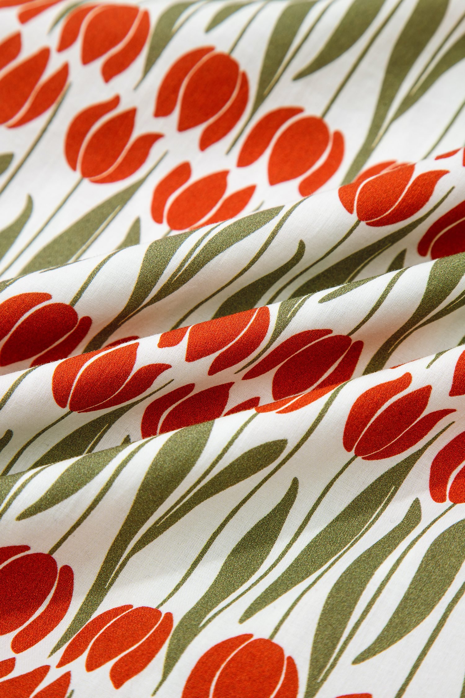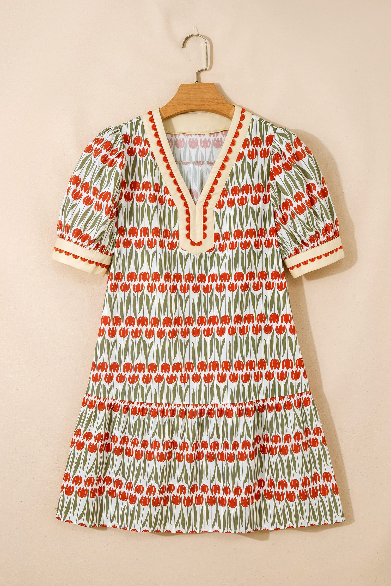 White Tulip Floral Print Cotton Puff Short Sleeve Mini Dress