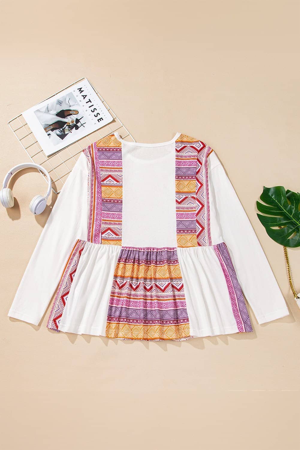 White Western Aztec Print Patchwork Ruffled Tunic Long Sleeve Babydoll Top