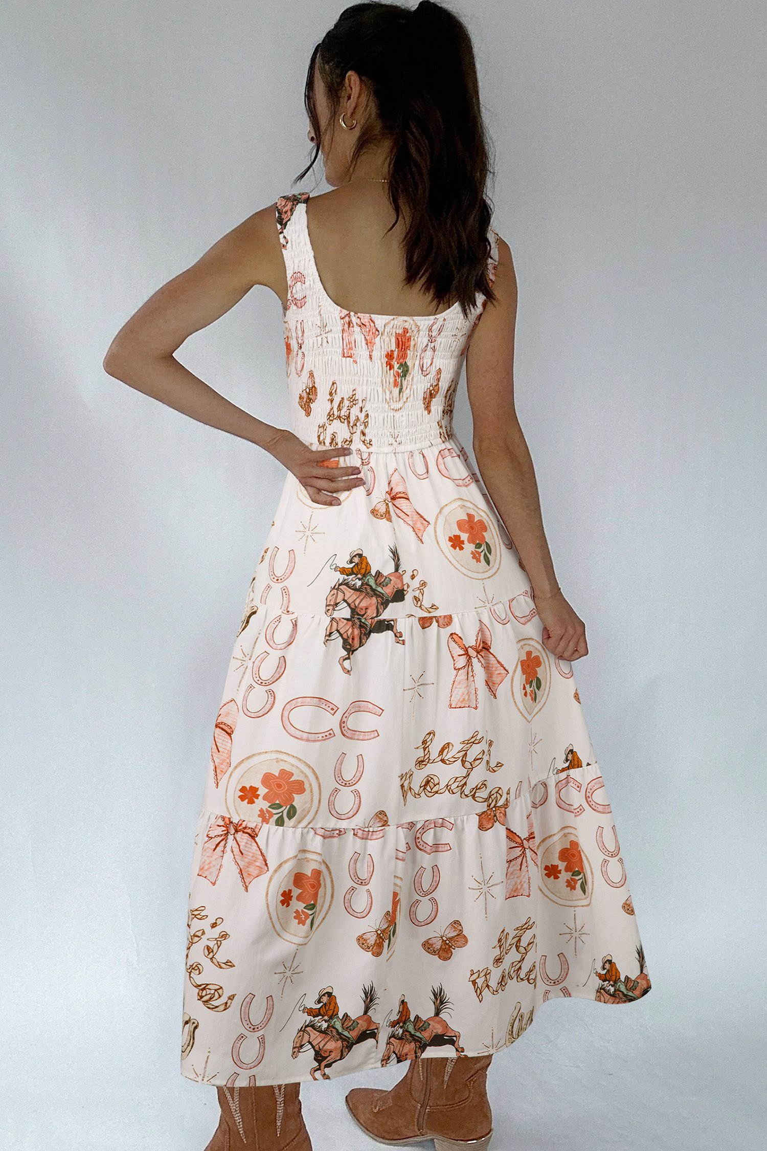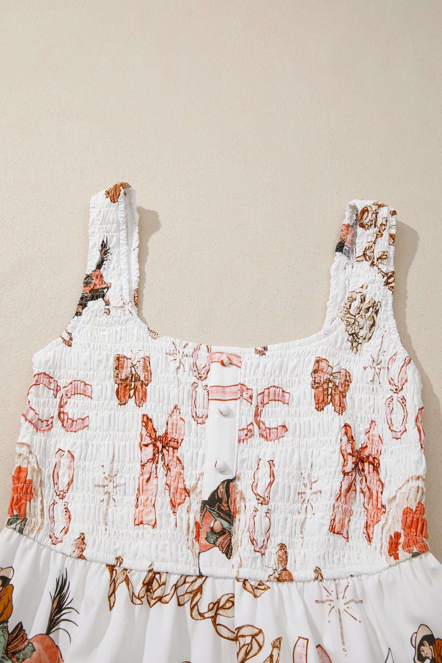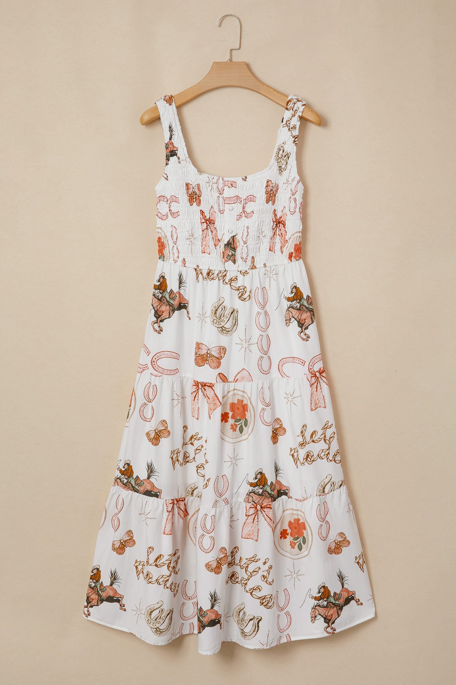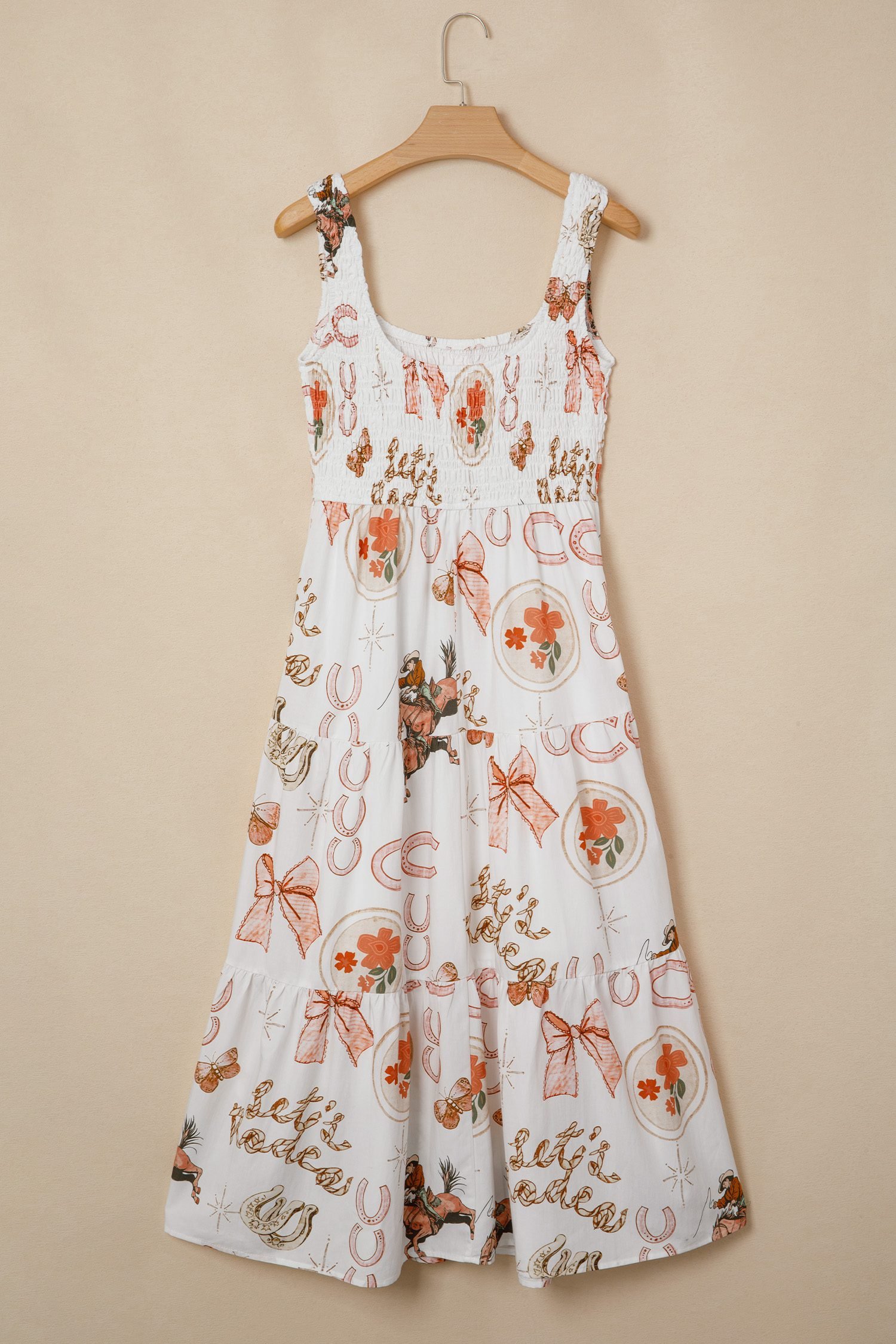 Sleeveless design with a shirred bodice and a tiered, flowy skirt.