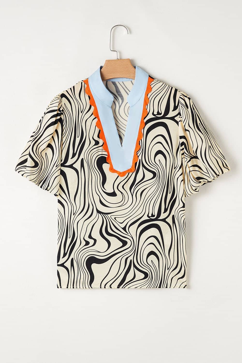 White Zebra Stripe Print Contrast V-Neck Ricrac Detail Short Sleeve Blouse Top