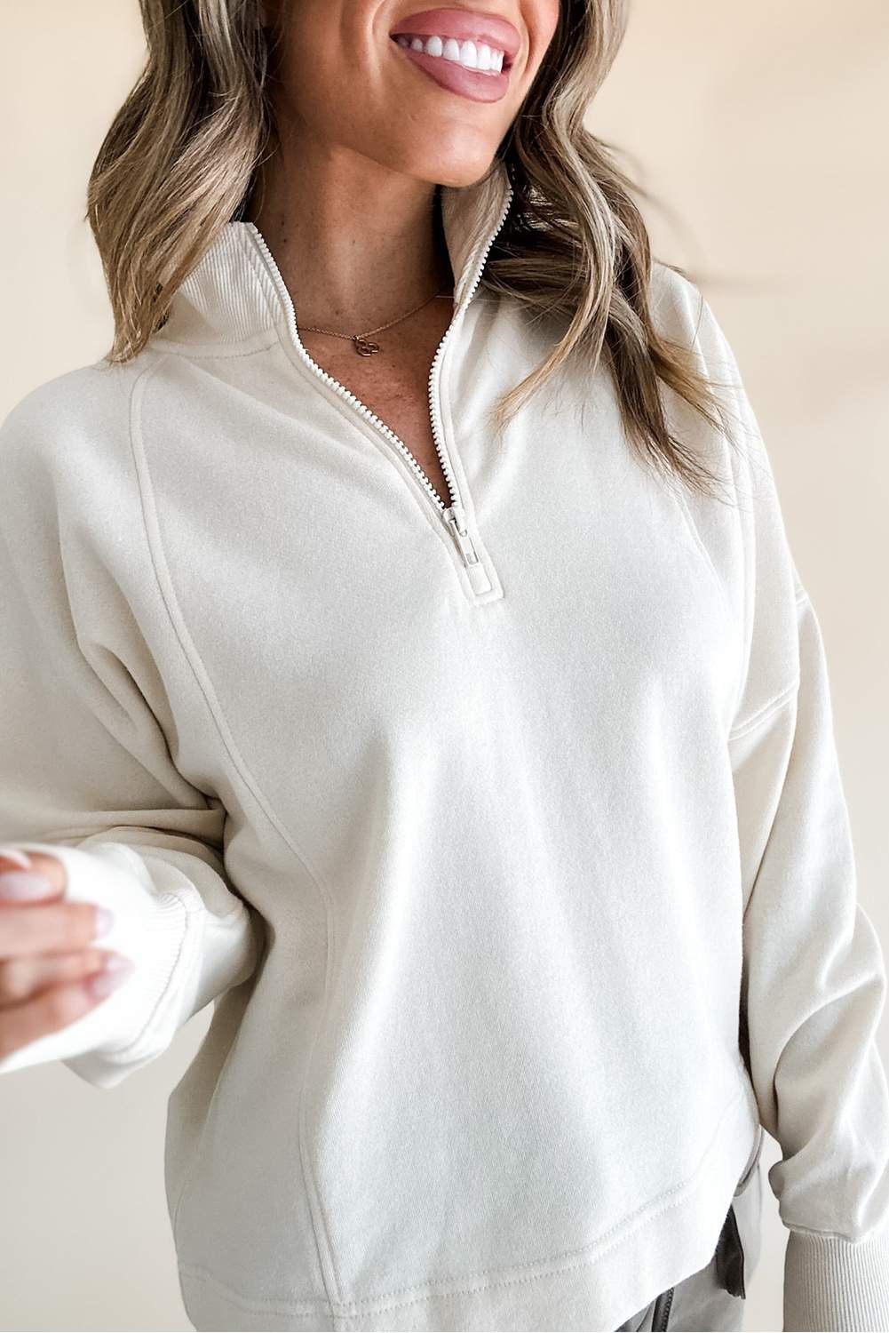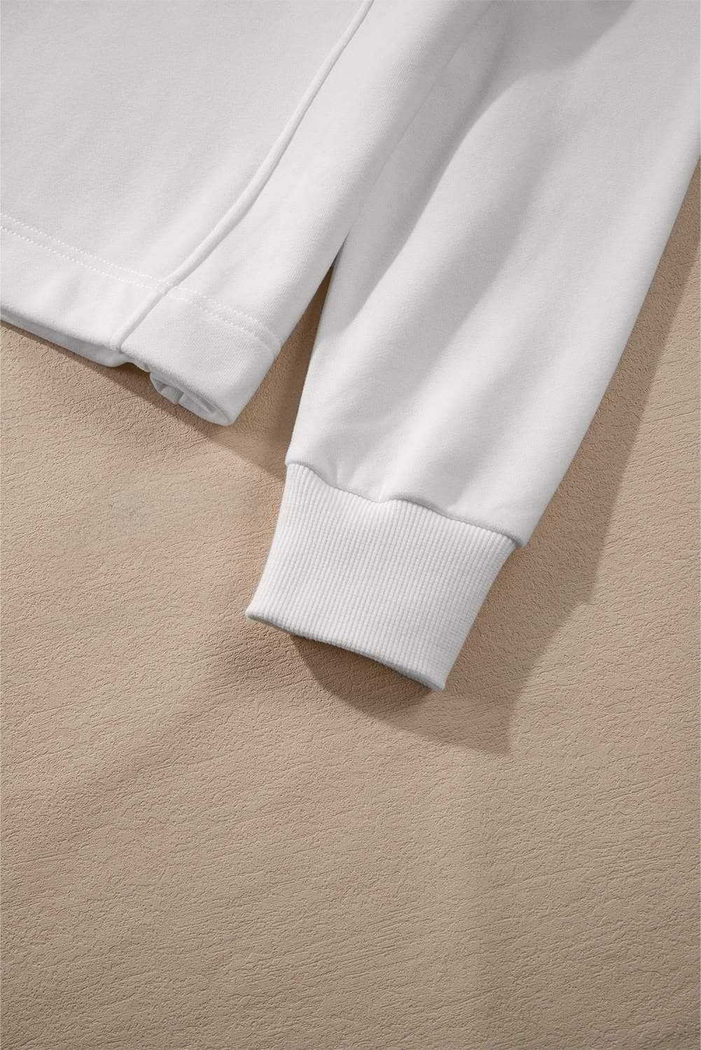 White Zipped Neck Pullover Drop Shoulder Sweatshirt
