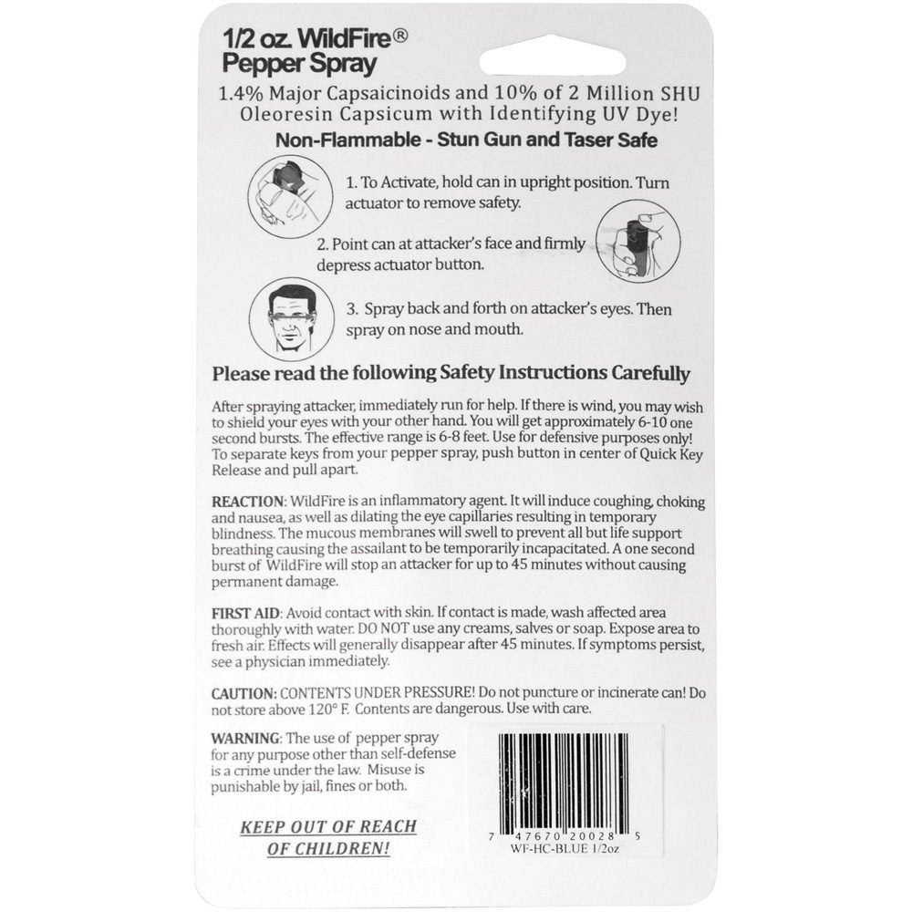 Wildfire 1/2 oz 1.4% MC pepper spray hard case and quick release keychain blue. The WILDFIRE? PEPPER SPRAY is hot, hot, hot. The Major Capsaicinoids are the true heat measure, WildFire has the hottest on the market at 1.4% Major Capsaicinoids. In addition to causing an attacker pain, The WildFire 10% oleoresin capsicum formula swells the mucous membranes, which makes breathing difficult, and swells the veins in the eyes, causing the eyes to close. It’s made from 2,000,000 SHU’s of raw pepper and these effects can last up to 45 minutes and cause no permanent damage. Has a UV identifying dye to help aid in the identification of an attacker. Wildfire 1/2 oz. Pepper Spray has a range of 6-8 feet and comes with a hard case. Each unit provides 6-10 one-second bursts and comes with a quick key release keychain, and safety lock. 3 ?” x 1 ?”