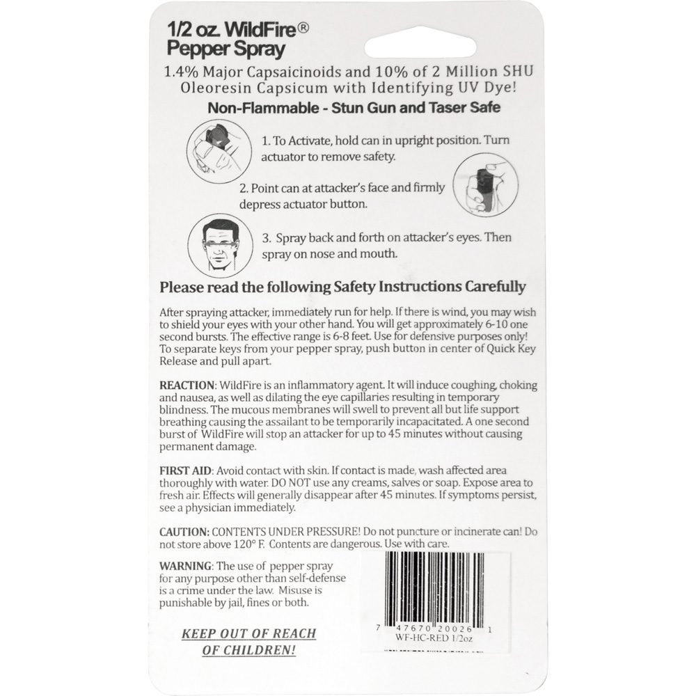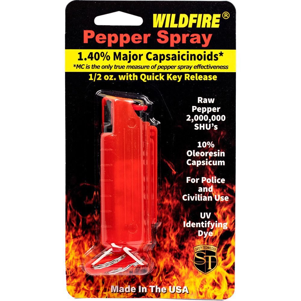 Wildfire 1/2 oz 1.4% MC pepper spray hard case and quick release keychain red. The WILDFIRE? PEPPER SPRAY is hot, hot, hot. The Major Capsaicinoids are the true heat measure, WildFire has the hottest on the market at 1.4% Major Capsaicinoids. In addition to causing an attacker pain, The WildFire 10% oleoresin capsicum formula swells the mucous membranes, which makes breathing difficult, and swells the veins in the eyes, causing the eyes to close. It’s made from 2,000,000 SHU’s of raw pepper and these effects can last up to 45 minutes and cause no permanent damage. Has a UV identifying dye to help aid in the identification of an attacker. Wildfire 1/2 oz. Pepper Spray has a range of 6-8 feet and comes with a hard case. Each unit provides 6-10 one-second bursts and comes with a quick key release keychain, and safety lock. 3 ?” x 1 ?”