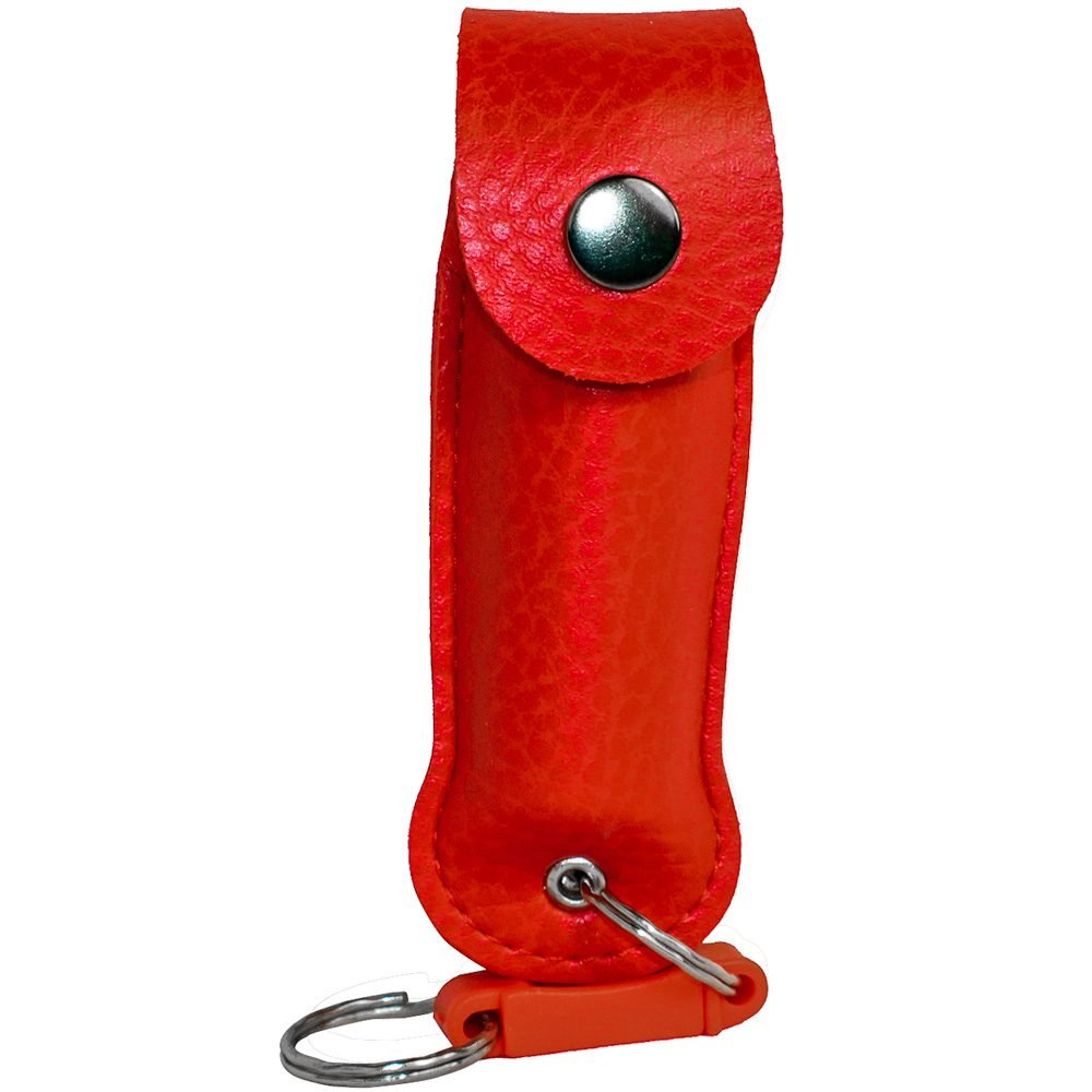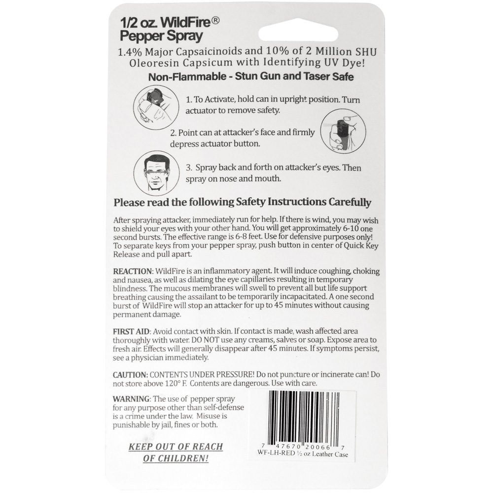 Wildfire 1/2 oz leatherette holster and Quick Release Key Chain red. The WILDFIRE? PEPPER SPRAY is hot, hot, hot. The Major Capsaicinoids are the true heat measure, WildFire has the hottest on the market at 1.4% Major Capsaicinoids. In addition to causing an attacker pain, The WildFire 10% oleoresin capsicum formula swells the mucous membranes, which makes breathing difficult, and swells the veins in the eyes, causing the eyes to close. It’s made from 2,000,000 SHU’s of raw pepper and these effects can last up to 45 minutes and cause no permanent damage. Has a UV identifying dye to help aid in the identification of an attacker. Wildfire 1/2 oz. Pepper Spray has a range of 6-8 feet and comes with a leatherette holster. Each unit provides 6-10 one-second bursts and comes with a quick key release keychain, and safety lock. 4 ?” x 1 ?”