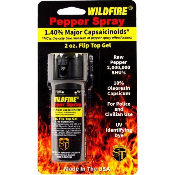 Wildfire 2 oz 1.4% MC flip top actuator pepper gel stream. The WILDFIRE? PEPPER SPRAY is hot, hot, hot. The Major Capsaicinoids are the true heat measure, WildFire has the hottest on the market at 1.4% Major Capsaicinoids. In addition to causing an attacker pain, The WildFire 10% oleoresin capsicum formula swells the mucous membranes, which makes breathing difficult, and swells the veins in the eyes, causing the eyes to close. It’s made from 2,000,000 SHU’s of raw pepper and these effects can last up to 45 minutes and cause no permanent damage. Has a UV identifying dye to help aid in the identification of an attacker. Once sprayed this Pepper Gel acts like glue to your assailant. If the attacker attempts to wipe or rub the Pepper Gel away it begins to permeate the skin leaving your attacker in pain. If used properly indoors you don?t have to worry about overspray, as it will stay in the direction where its sprayed and will not affect others in close proximity. Pepper Gel Sticky Pepper Spray is ideal for a car, recreational vehicle, camping, or home. This Pepper Gel Sticky Pepper Spray has many convenient features including: longer distance range, stronger pepper mixture, sticks to the target like glue, its also less contaminating, and nonflammable. Approximately 6-8 one second burst & range of 8-10 feet. 4 ?” x 1 ?”
