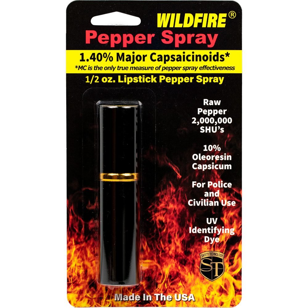 WildFire lipstick pepper spray is a 1.4% Major Capsaicinoids pepper spray. The WildFire? pepper spray is hot, hot, hot. The Major Capsaicinoids are the true heat measure, WildFire has the hottest on the market at 1.4% Major Capsaicinoids. In addition to causing an attacker pain, The WildFire 10% oleoresin capsicum formula swells the mucous membranes, which makes breathing difficult, and swells the veins in the eyes, causing the eyes to close. It’s made from 2,000,000 SHU’s of raw pepper and these effects can last up to 45 minutes and cause no permanent damage. Has a UV identifying dye to help aid in the identification of an attacker. This lipstick model is designed for women. The attractive lipstick case is sure to deceive and ward off potential attackers. Pretend you need to freshen your lipstick and POW! This ? oz canister contains 6-10 one-second sprays with a range of 6-8 feet and is available in 4 colors. – Black, Pink, Red, and Silver 4? x ??