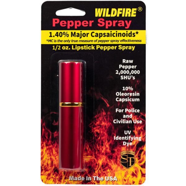WildFire lipstick pepper spray is a 1.4% Major Capsaicinoids pepper spray. The WildFire? pepper spray is hot, hot, hot. The Major Capsaicinoids are the true heat measure, WildFire has the hottest on the market at 1.4% Major Capsaicinoids. In addition to causing an attacker pain, The WildFire 10% oleoresin capsicum formula swells the mucous membranes, which makes breathing difficult, and swells the veins in the eyes, causing the eyes to close. It’s made from 2,000,000 SHU’s of raw pepper and these effects can last up to 45 minutes and cause no permanent damage. Has a UV identifying dye to help aid in the identification of an attacker. This lipstick model is designed for women. The attractive lipstick case is sure to deceive and ward off potential attackers. Pretend you need to freshen your lipstick and POW! This ? oz canister contains 6-10 one-second sprays with a range of 6-8 feet and is available in 4 colors. – Black, Pink, Red, and Silver 4? x ??