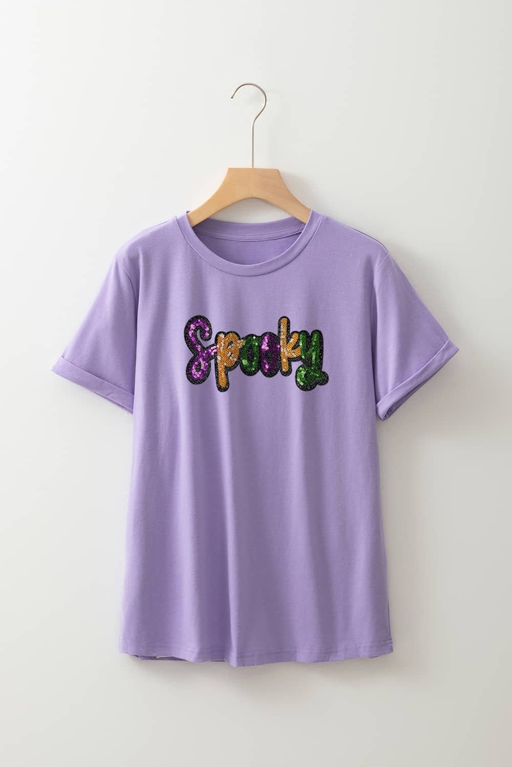 It says Spooky with a sequin patched letter graphic.