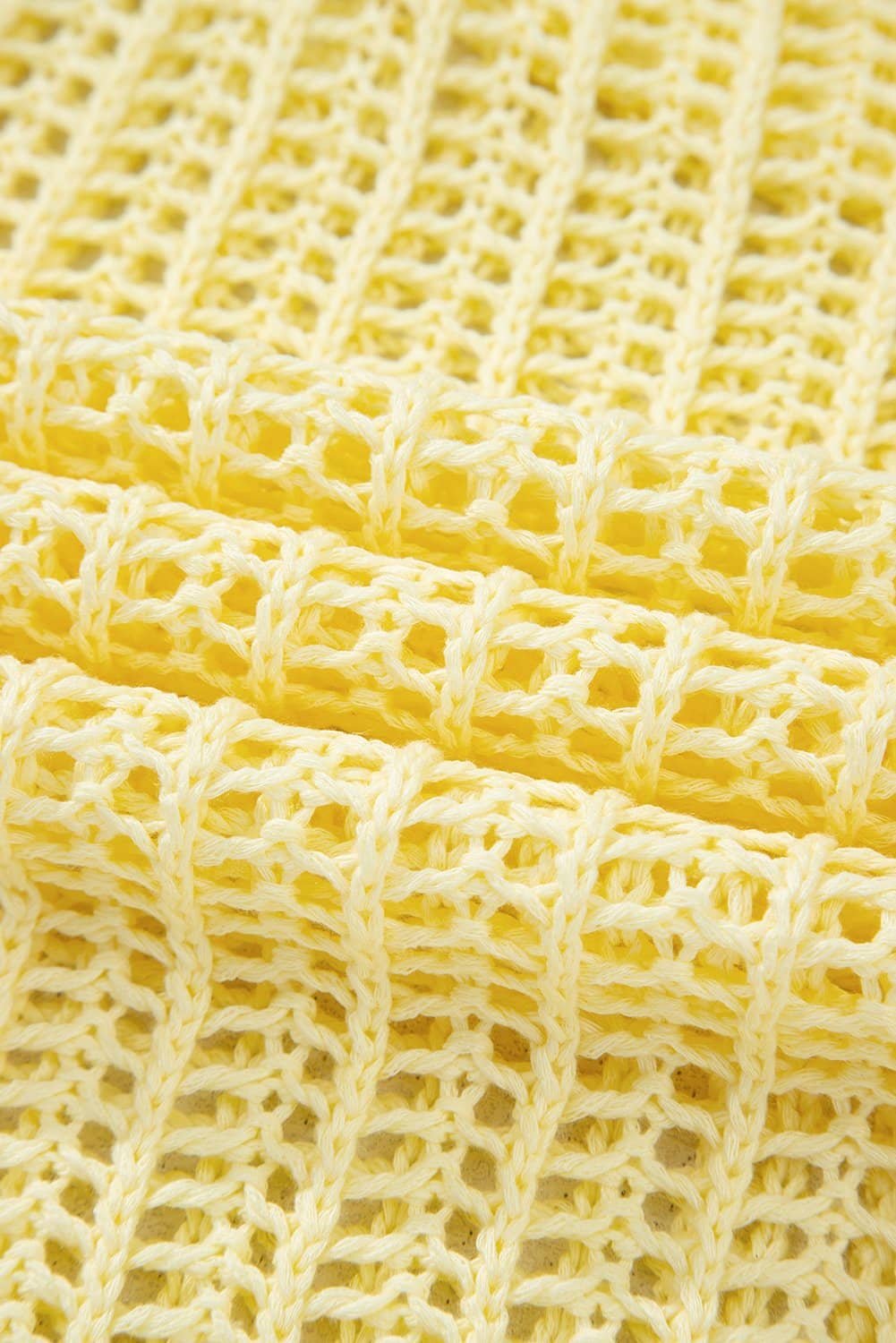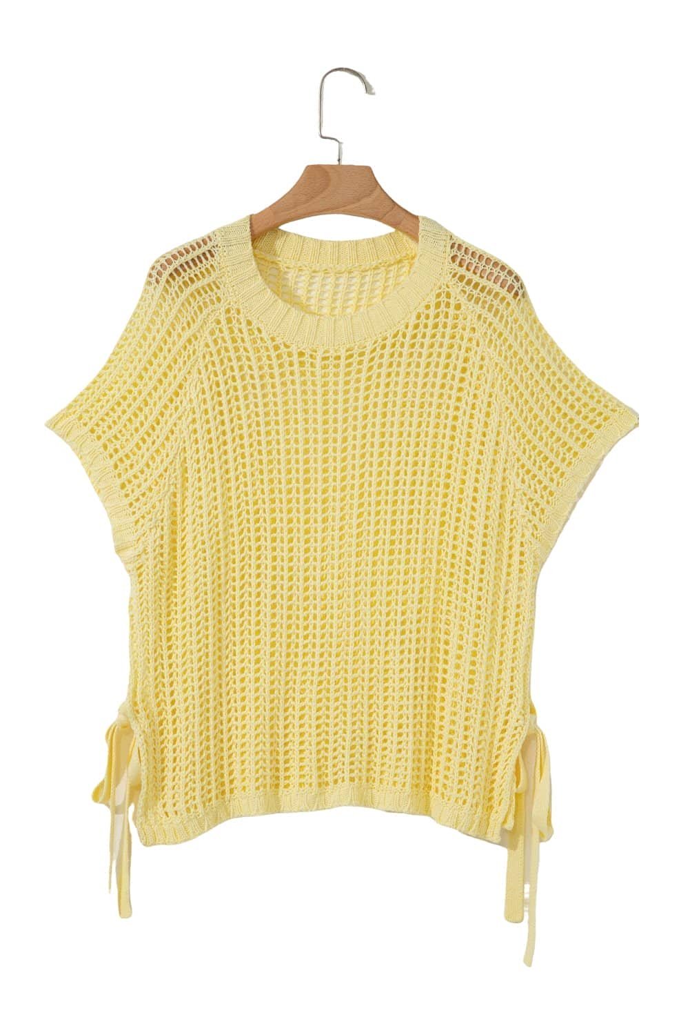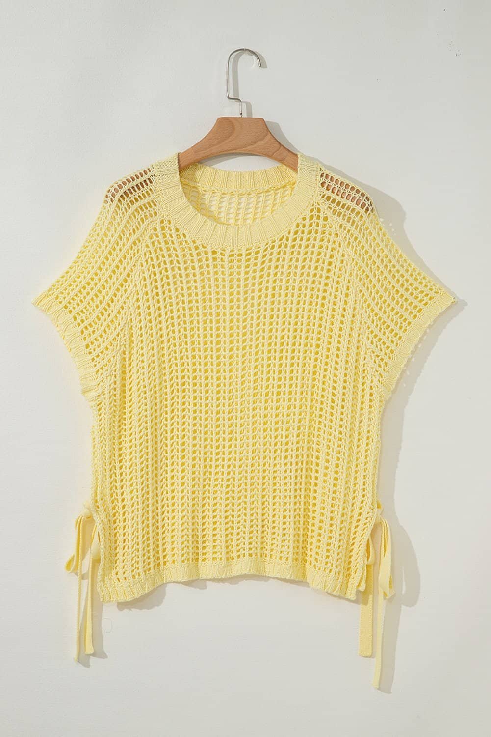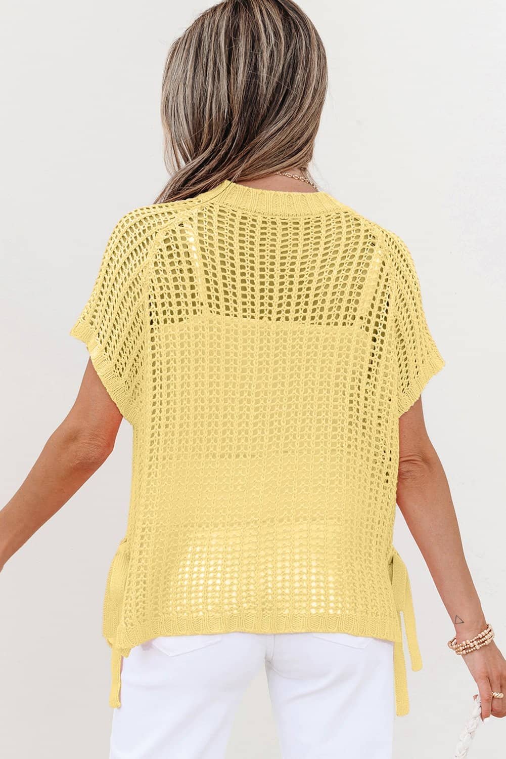 Yellow Cream Hollow-Out Crochet Side Tied Short Sleeve Sweater