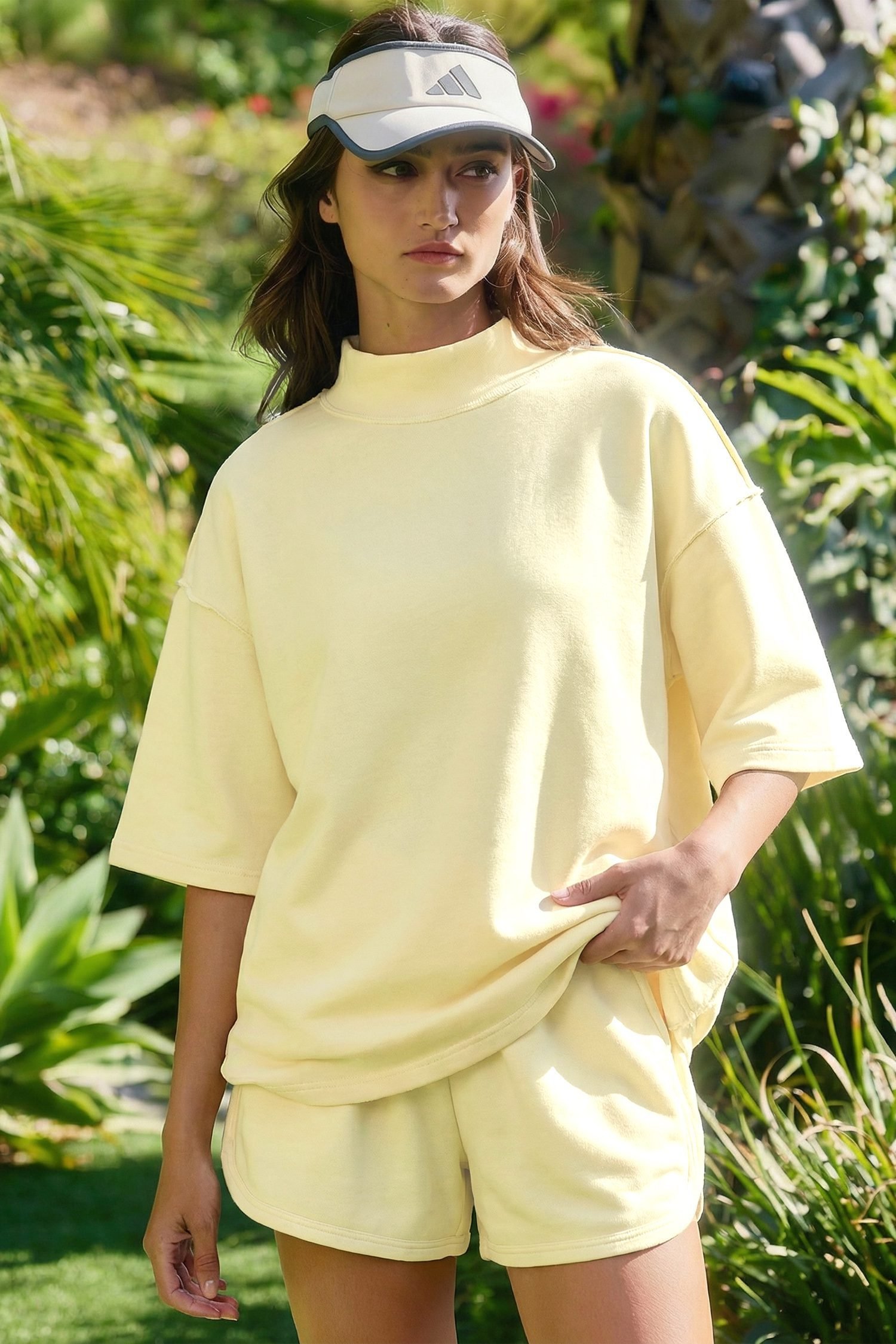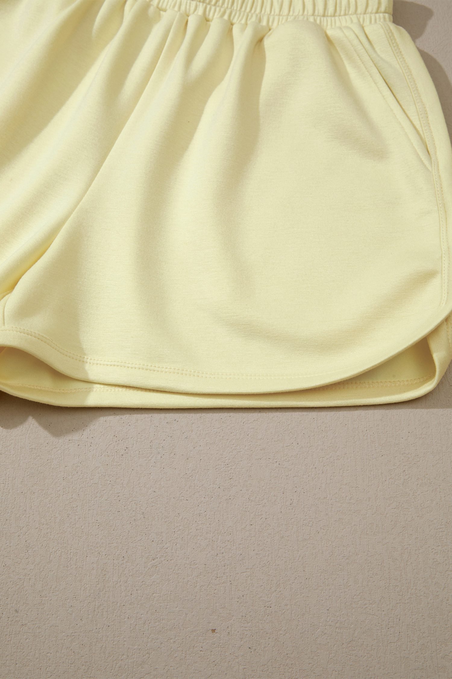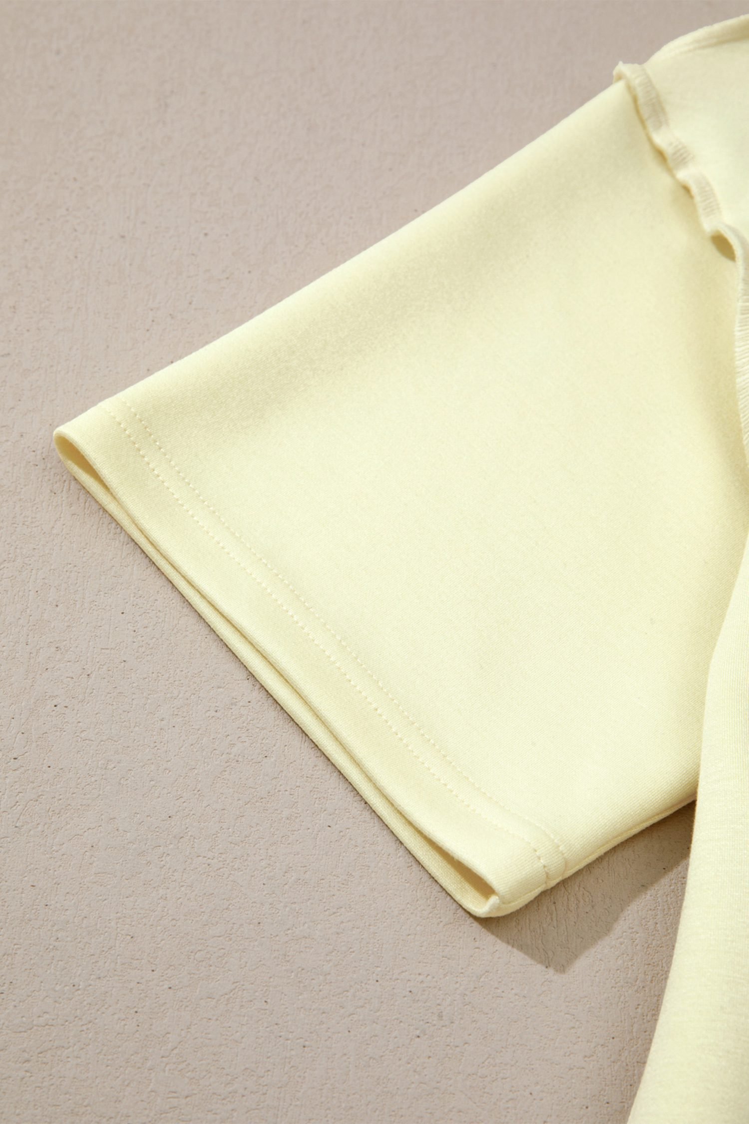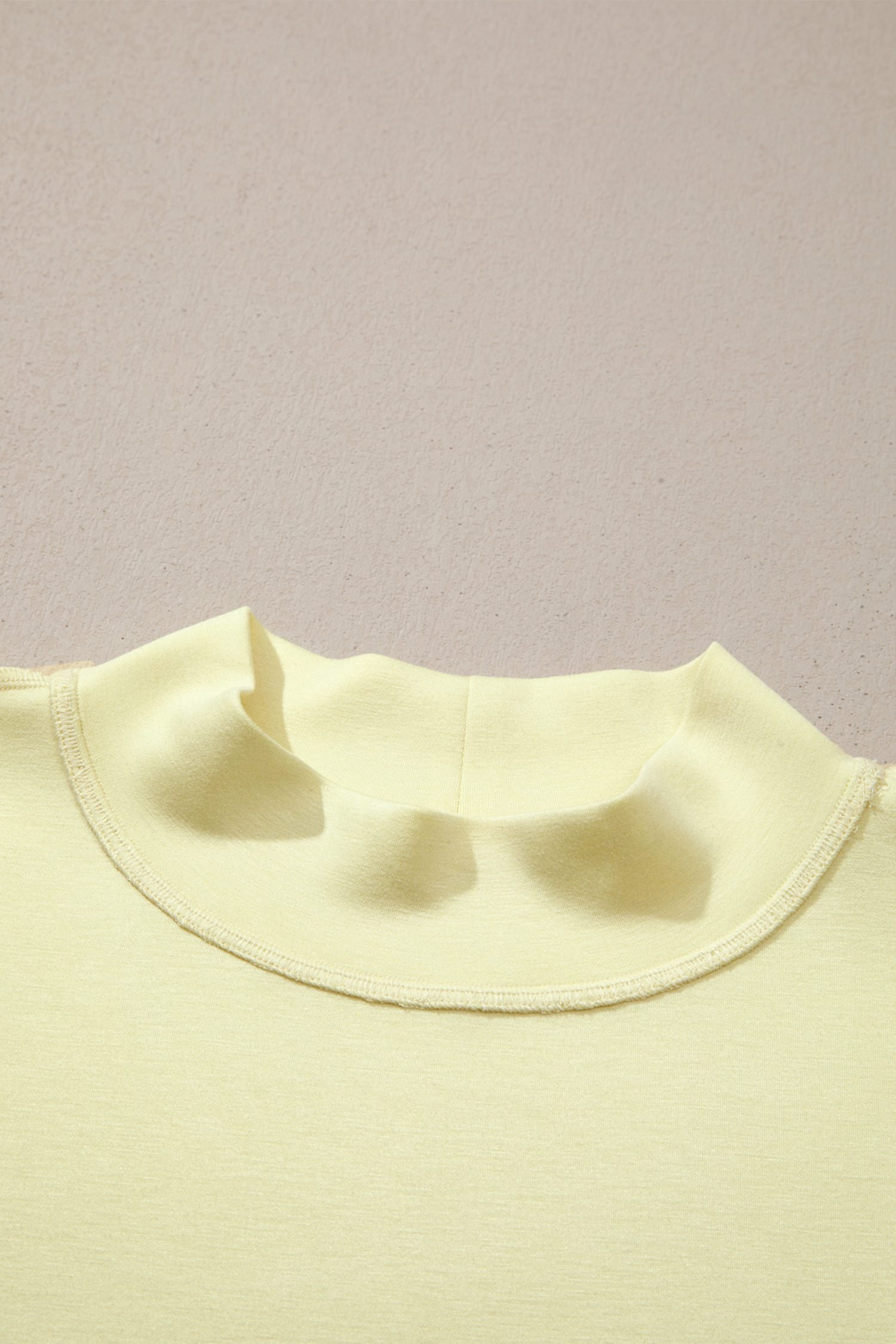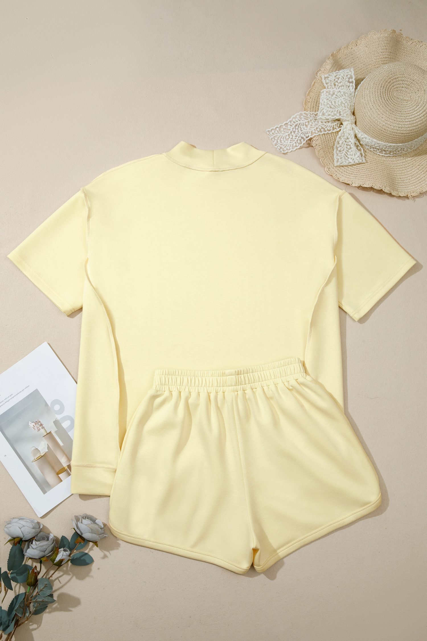 Yellow Cream Solid Color Exposed Seam Mock Neck Oversize Tee Casual Shorts 2pcs Outfit