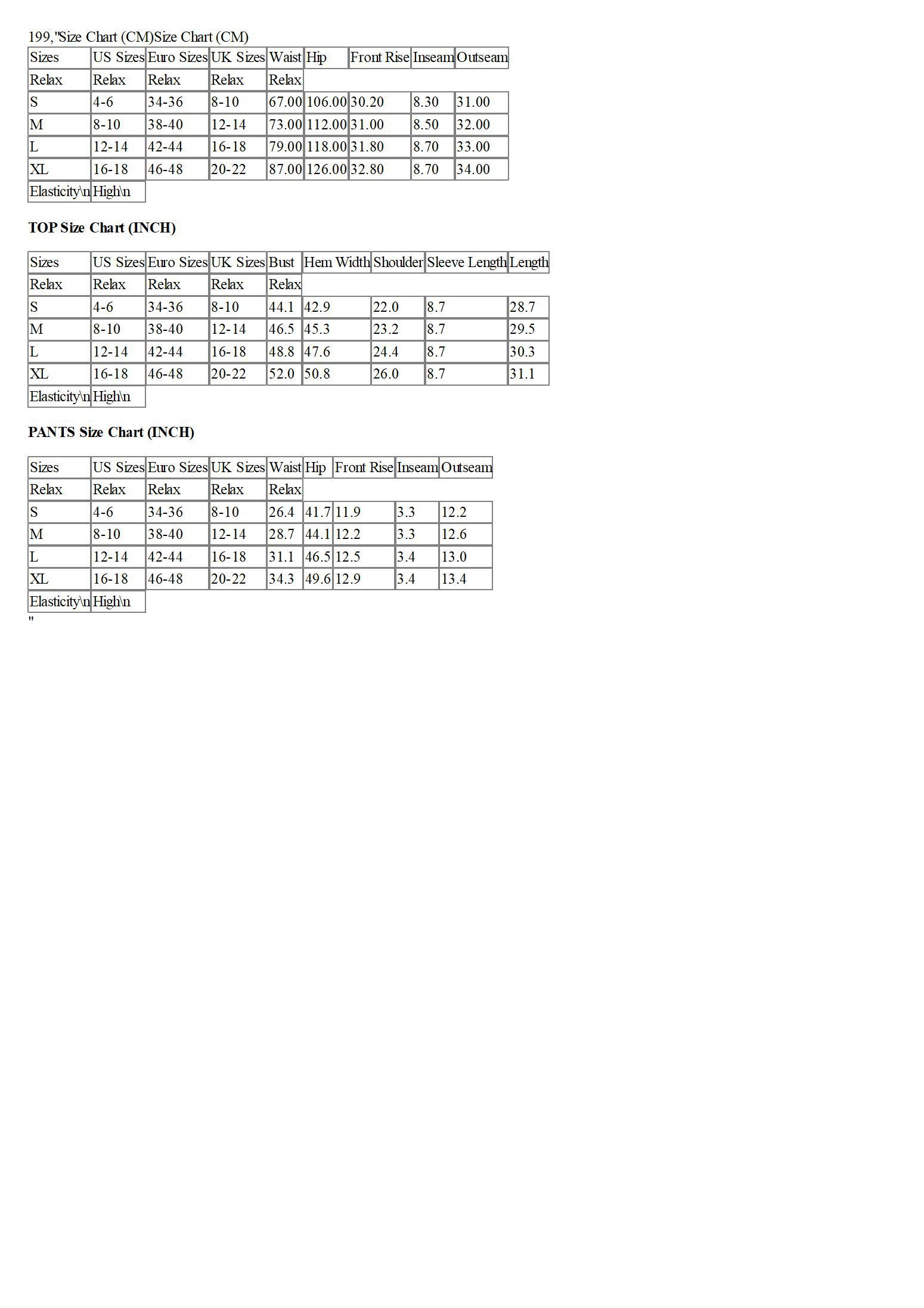 TOP Size Chart (CM)