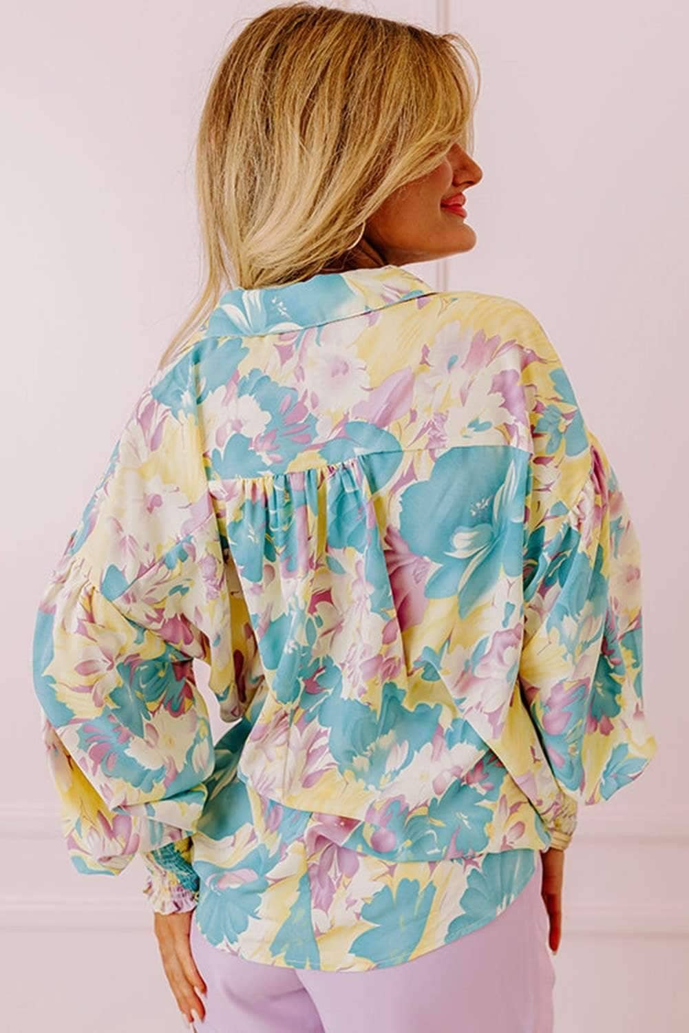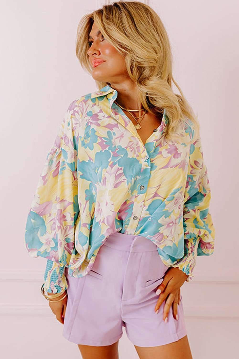 The shirred cuffs add a feminine detail to the vibrant floral pattern.