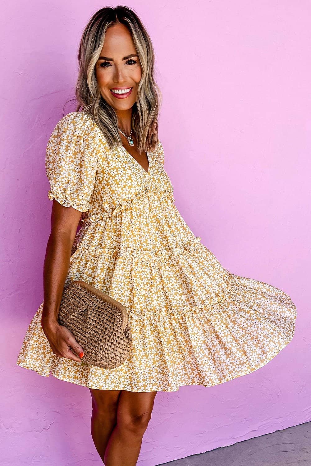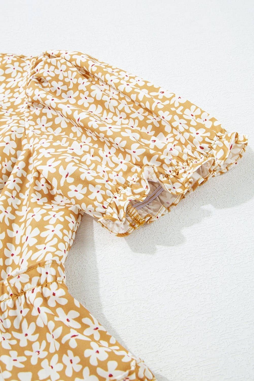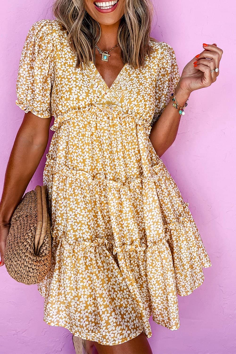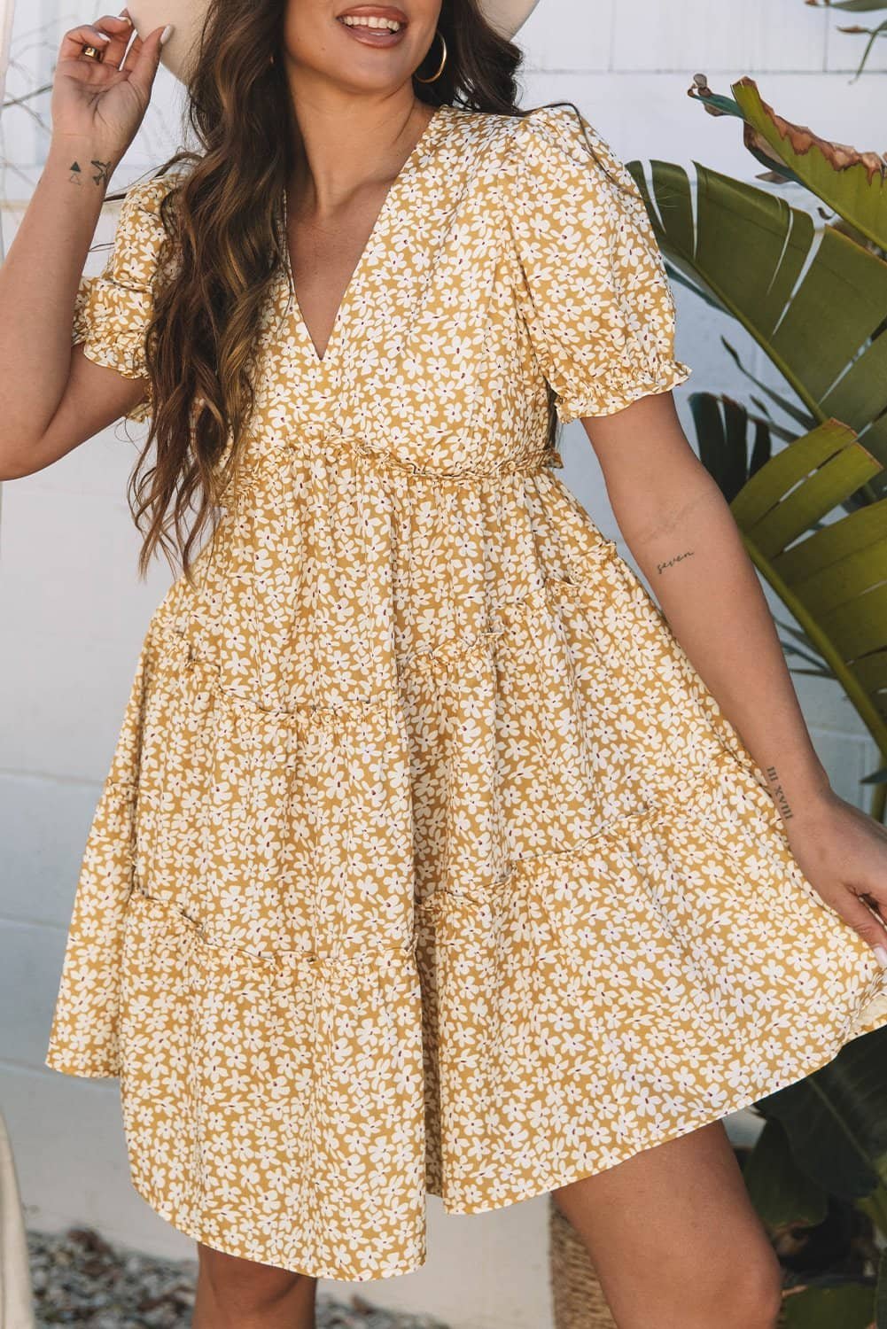 Flattering V-neckline with tiered frilly details for a charming look.