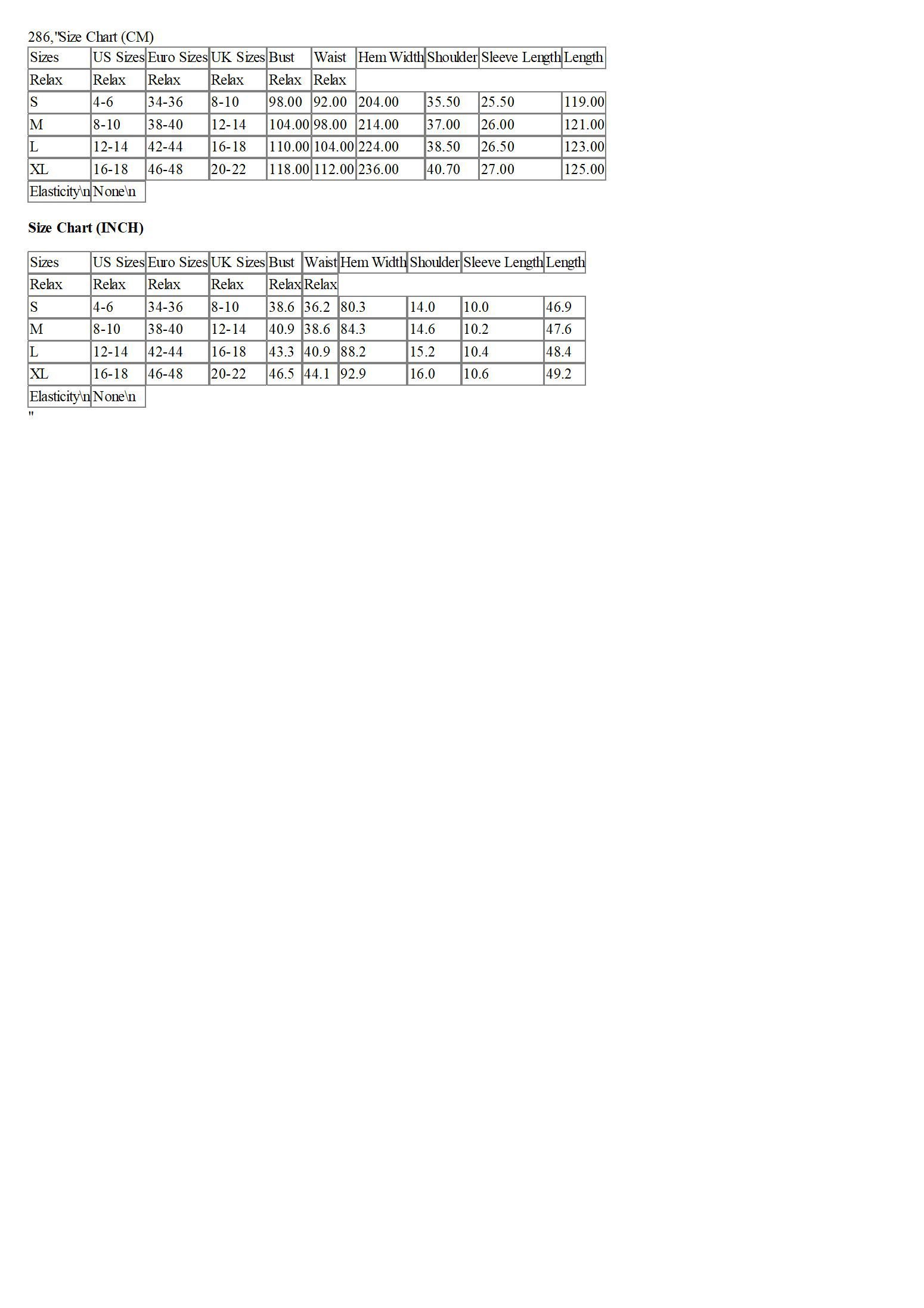 Sizes | US Sizes | Euro Sizes | UK Sizes | Bust | Waist | Hem Width | Shoulder | Sleeve Length | Length |