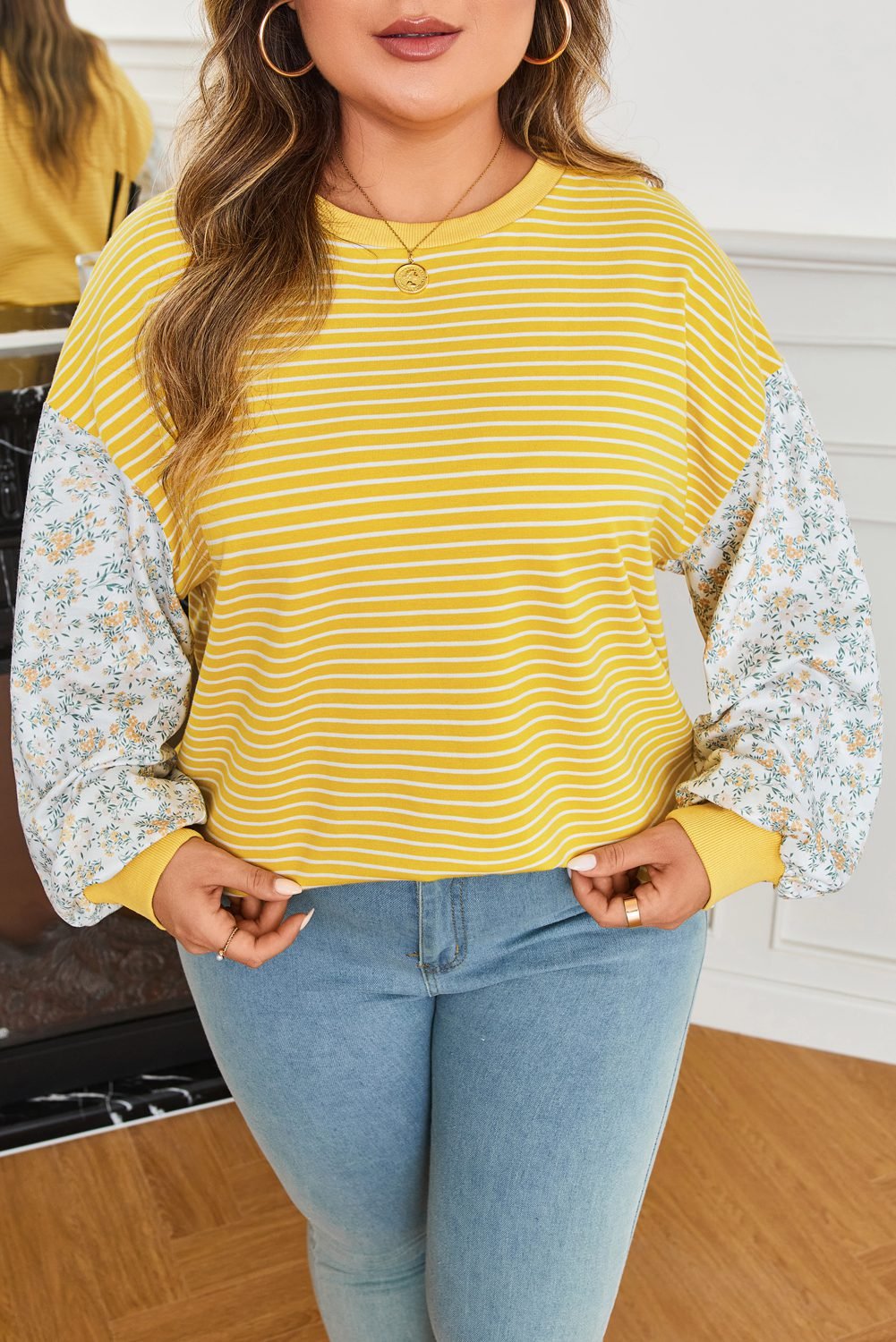- Stylish striped patchwork plus size top with floral sleeve detail adds trendy charm.
